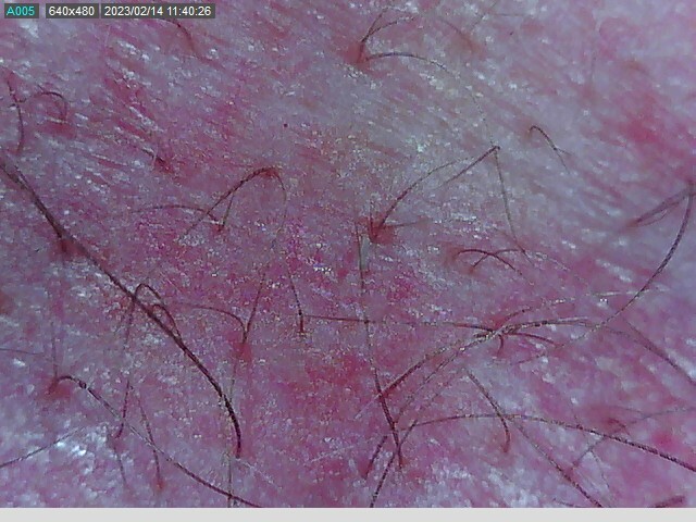 El patrón de la alopecia androgenética se caracteriza por la presencia en las áreas de la alopecia de puntos amarillos que se relacionan con cúmulos de queratina y más aún con sebo en el folículo piloso en relación con el aumento de tamaño de las glándulas sebáceas causado por una hipersensibilidad andrógeno dependiente existente en la patogenia de la misma. Se caracteriza la diversidad de diámetro del pelo en relación con la miniaturización progresiva del folículo piloso en puntos rojos e inflamación de la dermis como se puede observar en la Fig. 1 en comparación con una tricoscopia normal Fig. 2.